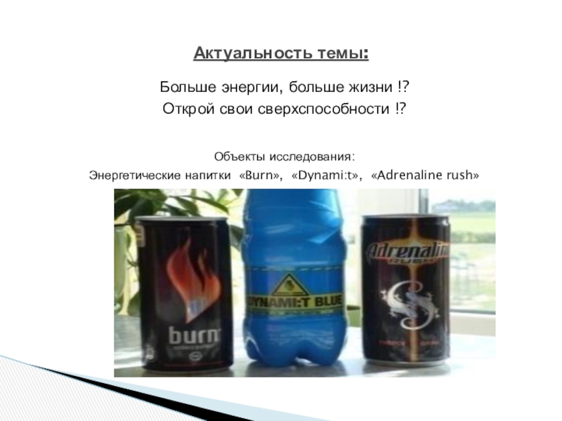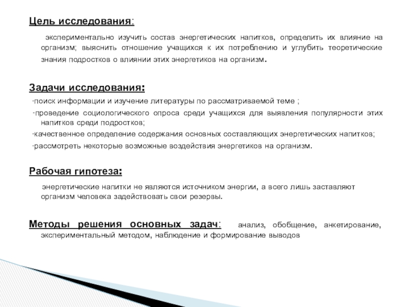 влияние на организм; выяснить отношение учащихся к их потреблению и углубить теоретические знания подростков о влиянии этих энергетиков на организм.