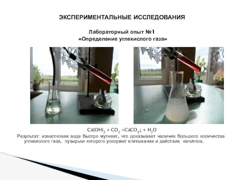 Результат: известковая вода быстро мутнеет, что доказывает наличие большого количества углекислого газа, пузырьки которого ускоряют впитывание и действие напитков.