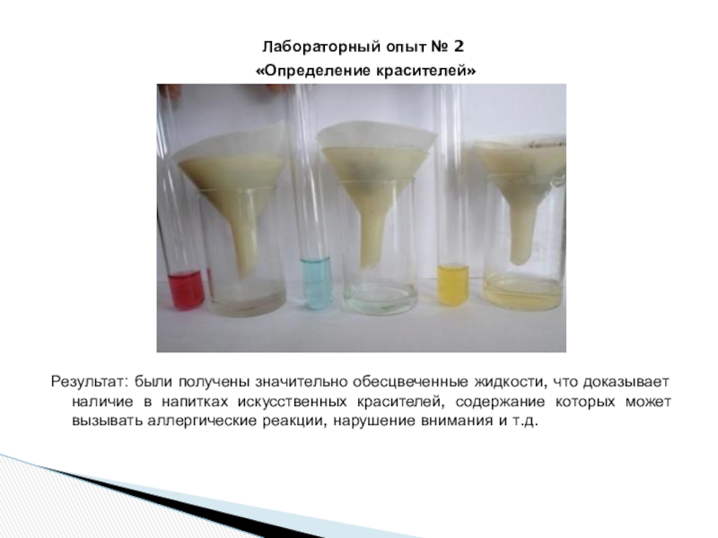 жидкости, что доказывает наличие в напитках искусственных красителей, содержание которых может вызывать аллергические реакции, нарушение внимания и т.д.