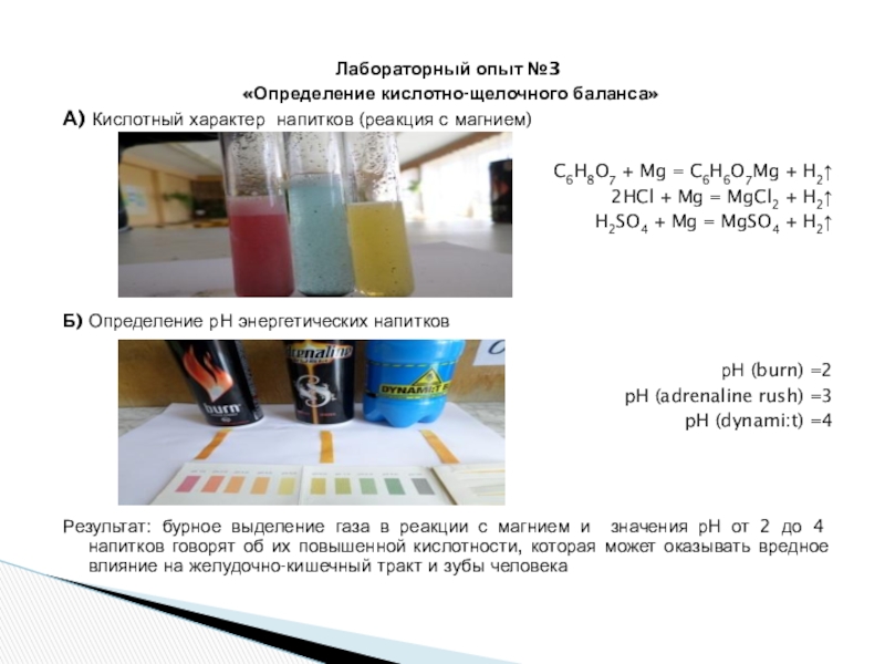 Результат: бурное выделение газа в реакции с магнием и значения рН от 2 до 4 напитков говорят об их повышенной кислотности, которая может оказывать вредное влияние на желудочно-кишечный тракт и зубы человека