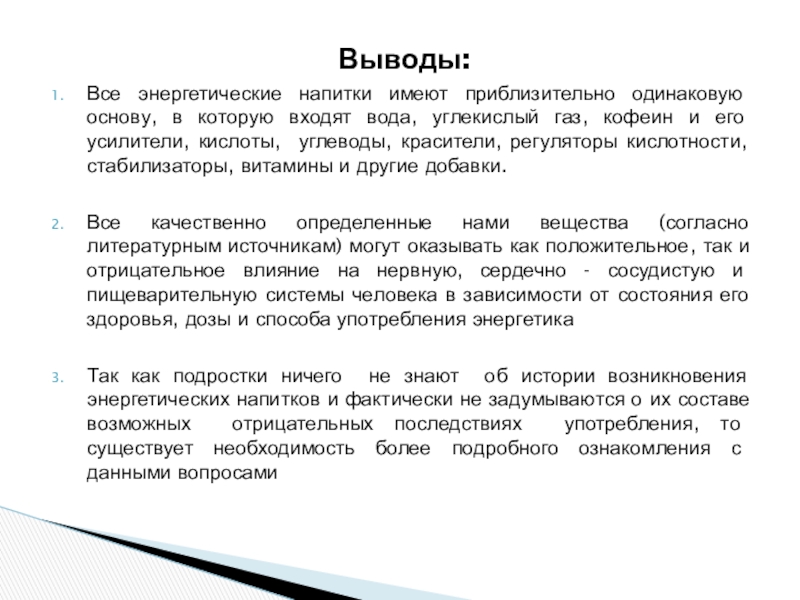 Все качественно определенные нами вещества (согласно литературным источникам) могут оказывать как положительное, так и отрицательное влияние на нервную, сердечно - сосудистую и пищеварительную системы человека в зависимости от состояния его здоровья, дозы и способа употребления энергетика