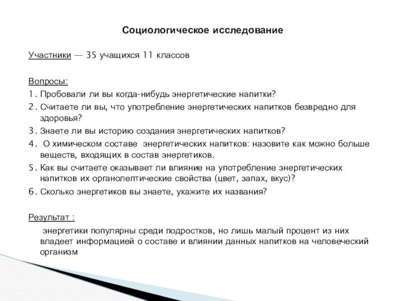 -проведение социологического опроса среди учащихся для выявления популярности этих напитков среди подростков;