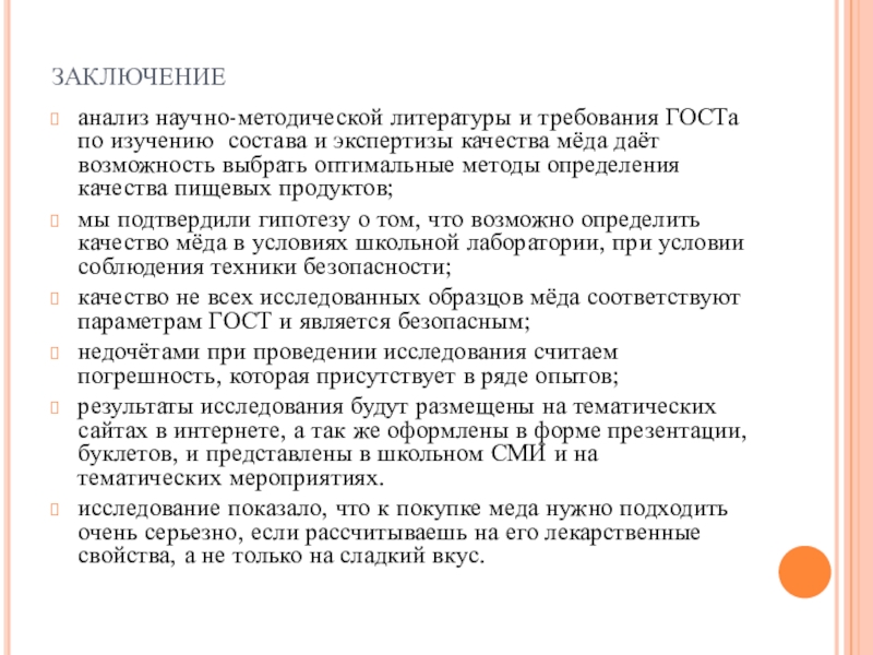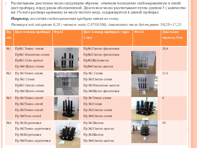 Вывод: мед в пробах 1 и 4 натуральный, мед в пробах 2 и 3 низкого качества или фальсифицированный. Содержание воды ни в одной пробе не обнаружено