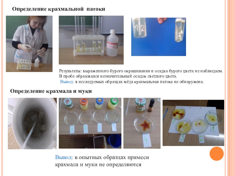 Вывод: в опытных образцах примеси крахмала и муки не определяются
