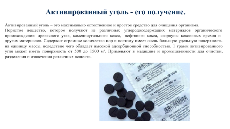 Пористое вещество, которое получают из различных углеродосодержащих материалов органического происхождения: древесного угля, каменноугольного кокса, нефтяного кокса, скорлупы кокосовых орехов и других материалов. Содержит огромное количество пор и поэтому имеет очень большую удельную поверхность на единицу массы, вследствие чего обладает высокой адсорбционной способностью. 1 грамм активированного угля может иметь поверхность от 500 до 1500 м². Применяют в медицине и промышленности для очистки, разделения и извлечения различных веществ.