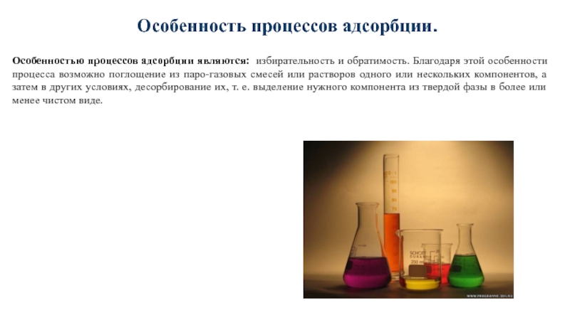 Особенностью процессов адсорбции являются: избирательность и обратимость. Благодаря