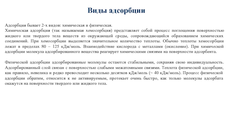 Физической адсорбции адсорбированные молекулы остаются стабильными, сохраняя свою индивидуальность. Адсорбированный слой связан с поверхностью слабыми межатомными связями. Теплота физической адсорбции, как правило, невелика и редко превосходит несколько десятков кДж/моль (~ 40 кДж/моль). Процесс физической адсорбции обратим, относится к не активируемым, протекает очень быстро, как только молекулы адсорбата окажутся на поверхности твердого или жидкого тела.