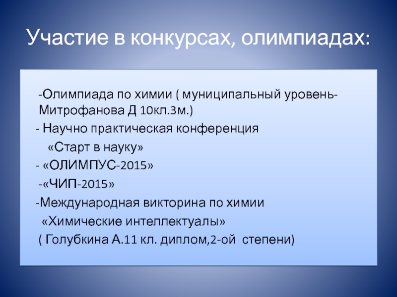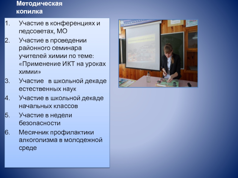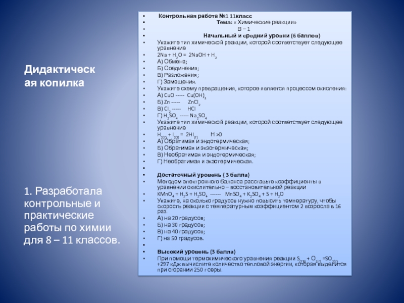 1. Разработала контрольные и практические работы по химии для 8 – 11 классов.