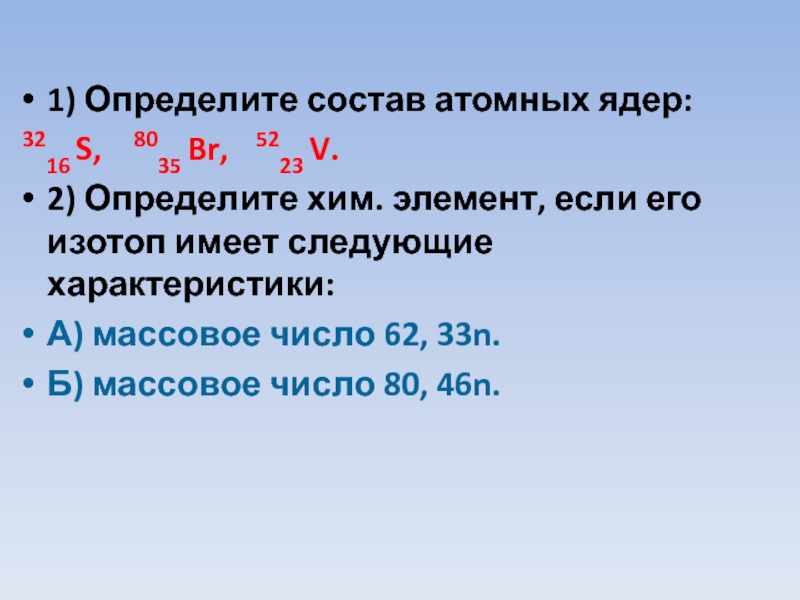 1) Определите состав атомных ядер: 3216 S,  8035 Br,   5223 V.2) Определите хим. элемент,