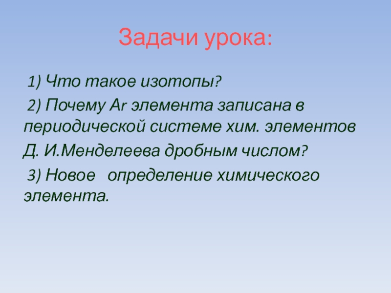 Задачи урока: 1) Что такое изотопы? 2) Почему Аr элемента записана в периодической системе хим. элементов Д. И.Менделеева дробным числом? 3) Новое определение химического элемента.