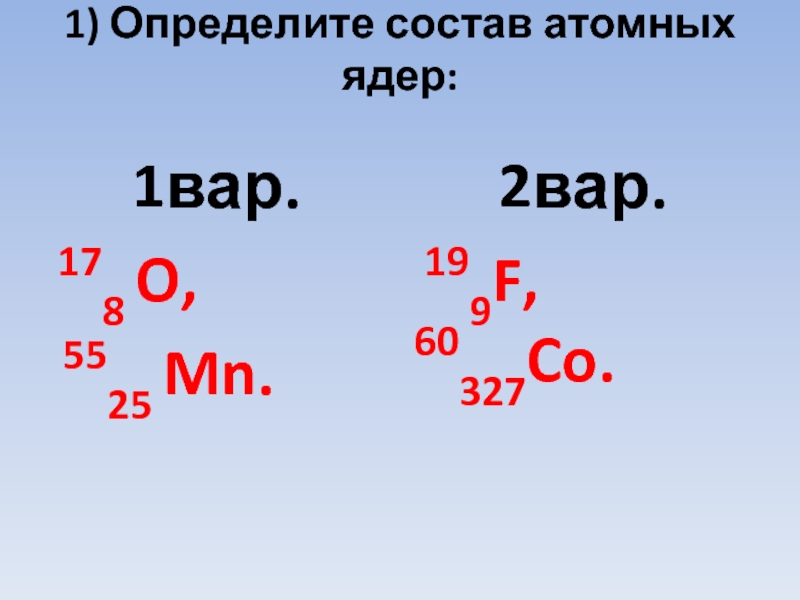 1) Определите состав атомных ядер: 1вар. 178 O,  5525 Mn.2вар. 199F,  60327Co.