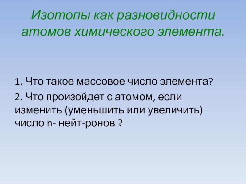 Изотопы как разновидности атомов химического элемента.1. Что такое массовое число элемента?2. Что произойдет с атомом, если изменить