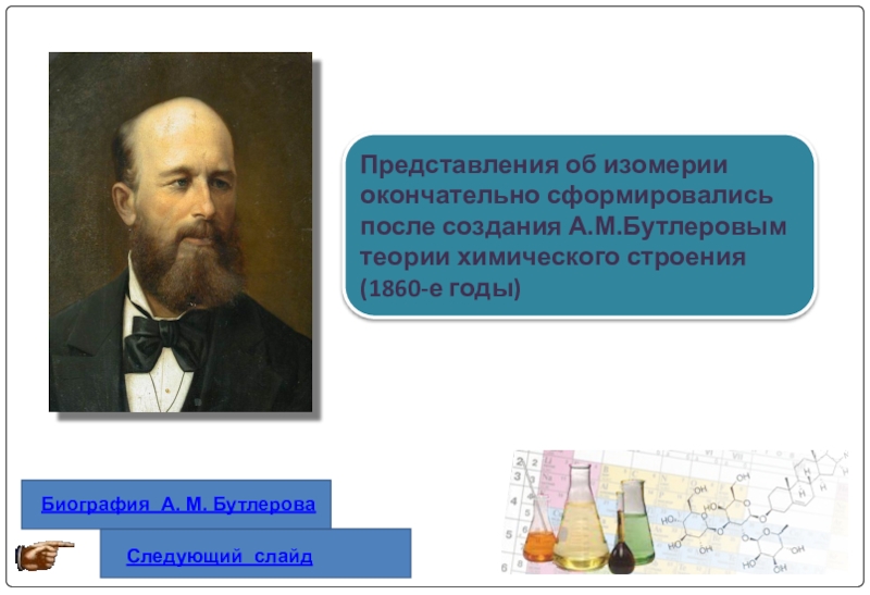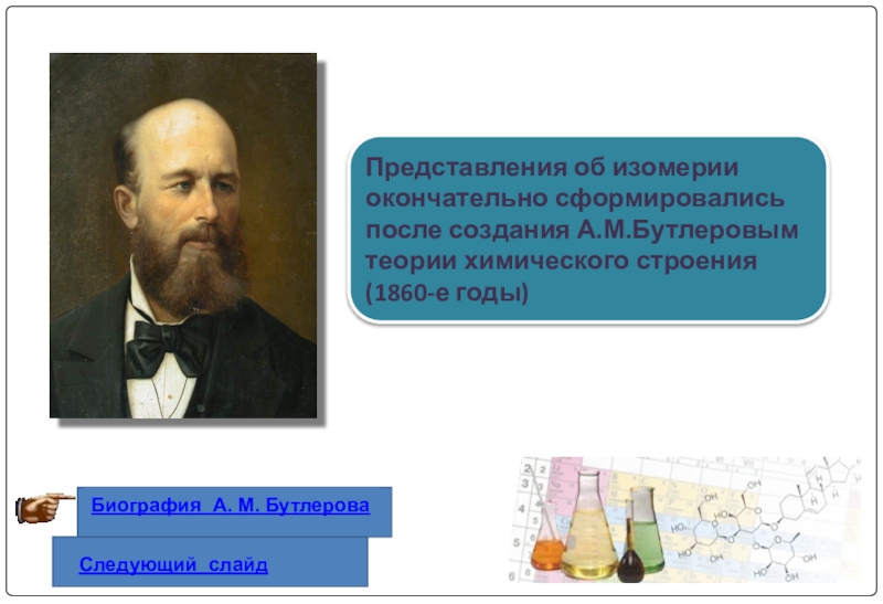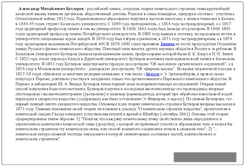 создатель теории химического строения, глава крупнейшей казанской школы химиков-органиков, общественный деятель. Родился в семье помещика, офицера в отставке - участника Отечественной войны 1812 года. Первоначальное образование получил в частном пансионе, а затем в гимназии в Казани, в 1844-49 годах студент Казанского университета. С 1849 года преподаватель, с 1854 года экстраординарный, а с 1857 года ординарный профессор химии в том же университете. В 1860-1863 годах был дважды его ректором. В 1868-1885 годах ординарный профессор химии Петербургского университета. В 1885 году вышел в отставку, но продолжал читать в университете специальные курсы лекций. В 1870 году был избран адъюнктом, в 1871 году экстраординарным, а в 1874 году ординарным академиком Петербургской АН. В 1878-1882 годах преемник Зинина на посту председателя Отделения химии Русского физико-химического общества. Почетный член многих других научных обществ в России и за рубежом. В Казанском университете Бутлеров увлекся преподаванием химии, профессорами которой были К. К. Клаус и Н. Н. Зинин. С 1852 года, после перехода Клауса в Дерптский университет, Бутлеров возглавил преподавание всей химии в Казанском университете. В 1851 году Бутлеров защитил магистерскую диссертацию "Об окислении органических соединений", а в 1854 году в Московском университете - докторскую диссертацию "Об эфирных маслах". Во время заграничной поездки в 1857-58 годах сблизился со многими видными химиками, в том числе с Кекуле и Э. Эрленмейером, и провел около полугода в Париже, деятельно участвуя в заседаниях только что организованного Парижского химического общества. В Париже, в лаборатории Ш. А. Вюрца, Бутлеров начал первый цикл экспериментальных исследований. Открыв новый способ получения йодистого метилена, Бутлеров получил и исследовал многочисленные его производные; впервые синтезировал гексаметилентетрамин (уротропин) и полимер формальдегида, который при обработке известковой водой переходил в сахаристое вещество (содержащее, как было установлено Э. Фишером, a-акрозу). По словам Бутлерова, это - первый полный синтез сахаристого вещества. Основные идеи теории химического строения Бутлеров впервые высказал в 1871 году. Главные положения своей теории он изложил в докладе "О химическом строении вещества", прочитанном в химической секции Съезда немецких естествоиспытателей и врачей в Шпейере (сентябрь 1861). Основы этой теории сформулированы таким образом: 1) "Полагая, что каждому химическому атому свойственно лишь определенное и ограниченное количество химической силы (сродства), с которой он принимает участие в образовании тела, я назвал бы химическим строением эту химическую связь, или способ взаимного соединения атомов в сложном теле"; 2) "... химическая натура сложной частицы определяется натурой элементарных составных частей, количеством их и химическим строением".