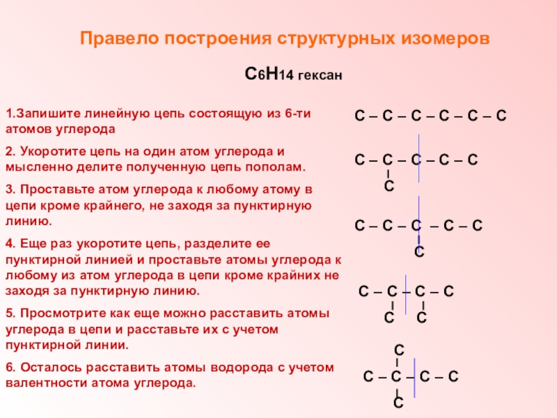 4. Еще раз укоротите цепь, разделите ее пунктирной линией и проставьте атомы углерода к любому из атом углерода в цепи кроме крайних не заходя за пунктирную линию.