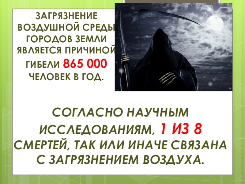 Согласно научным исследованиям, 1 из 8 смертей, так или иначе связана с загрязнением воздуха.