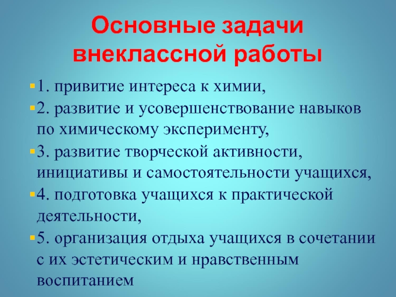 Подведение итогов работы факультативов, кружков, секций и активизация всех форм внеклассной и внешкольной работы с учащимися по химии