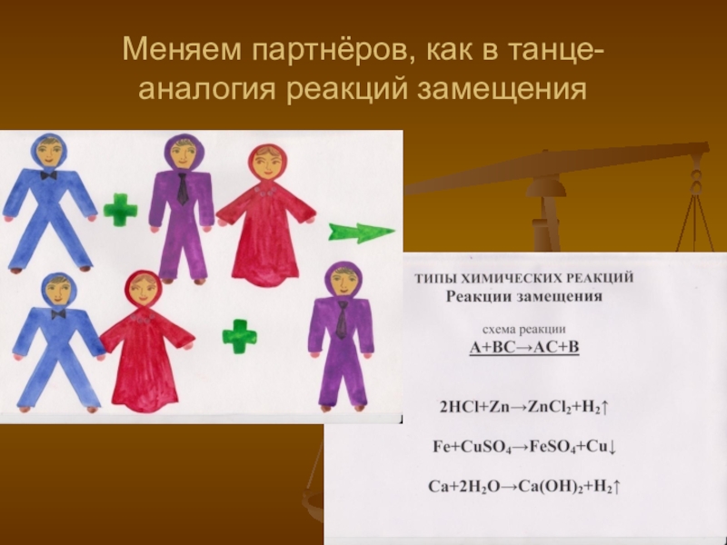 Слайд 7Рисунок, иллюстрирующий типы химических реакций. Аналогия человеческих отношений.
