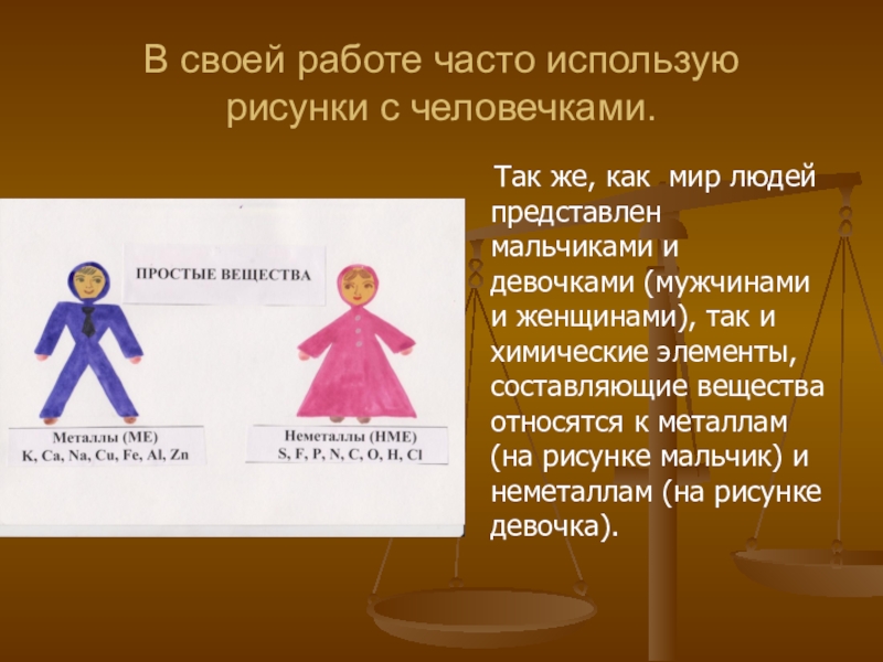 как мир людей представлен мальчиками и девочками (мужчинами и женщинами), так и химические элементы, составляющие вещества относятся к металлам (на рисунке мальчик) и неметаллам (на рисунке девочка).