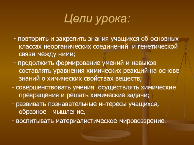 - продолжить формирование умений и навыков составлять уравнения химических реакций на основе знаний о химических свойствах веществ;