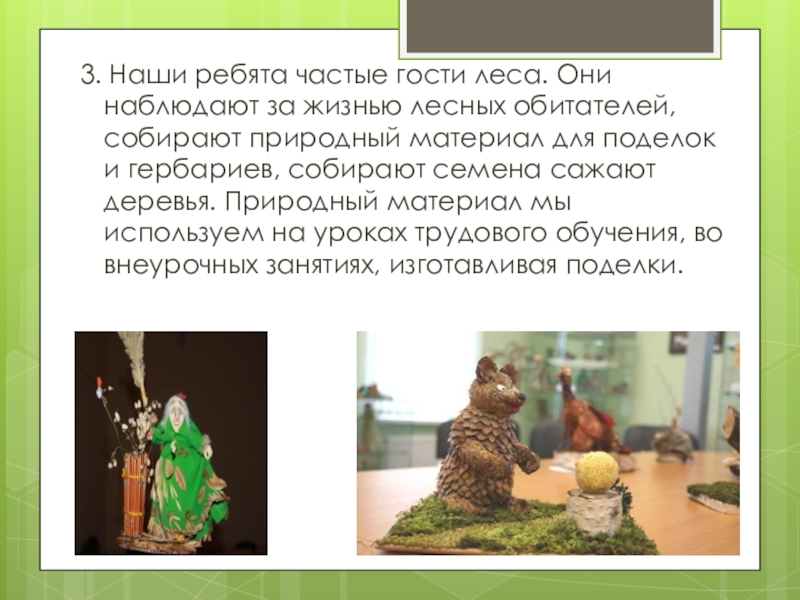 обитателей, собирают природный материал для поделок и гербариев, собирают семена сажают деревья. Природный материал мы используем на уроках трудового обучения, во внеурочных занятиях, изготавливая поделки.