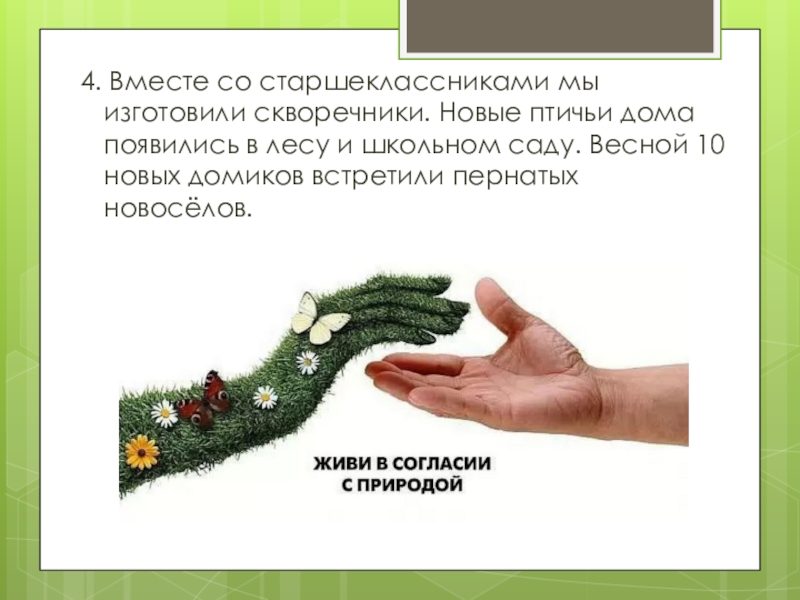 Слайд 304. Вместе со старшеклассниками мы изготовили скворечники. Новые птичьи дома появились