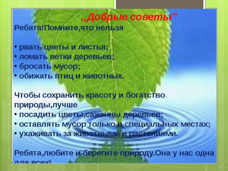 создать в школе «Зеленый патруль», который бы следил , чтобы никто не разорял птичьих гнезд, не ломал веток, не топтал траву;