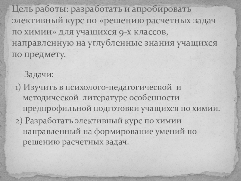 Цель работы: разработать и апробировать элективный курс по «решению расчетных задач по химии» для учащихся 9-х классов, направленную на углубленные знания учащихся по предмету.