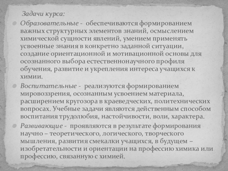 Воспитательные - реализуются формированием мировоззрения, осознанным усвоением материала, расширением кругозора в краеведческих, политехнических вопросах. Учебные задачи являются действенным способом воспитания трудолюбия, настойчивости, воли, характера.