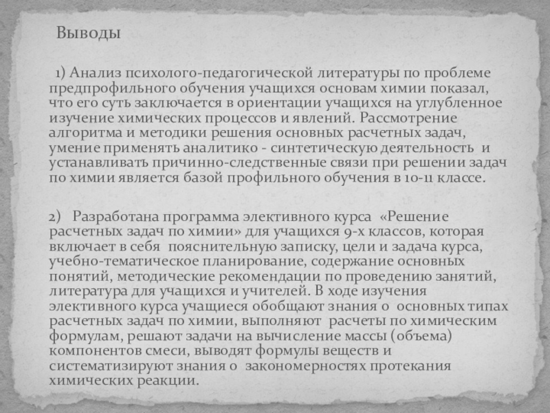 2) Разработана программа элективного курса «Решение расчетных задач по химии» для учащихся 9-х классов, которая включает в себя пояснительную записку, цели и задача курса, учебно-тематическое планирование, содержание основных понятий, методические рекомендации по проведению занятий, литература для учащихся и учителей. В ходе изучения элективного курса учащиеся обобщают знания о основных типах расчетных задач по химии, выполняют расчеты по химическим формулам, решают задачи на вычисление массы (объема) компонентов смеси, выводят формулы веществ и систематизируют знания о закономерностях протекания химических реакции.