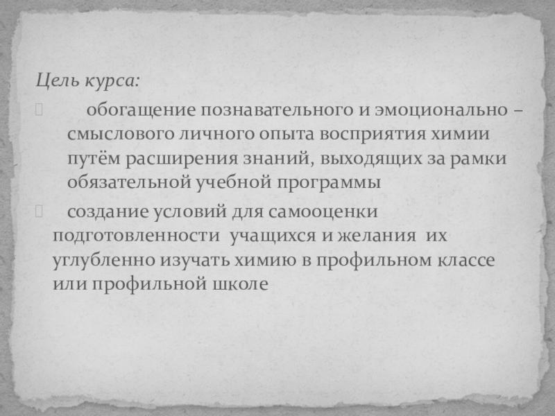 знаний, осмыслением химической сущности явлений, умением применять усвоенные знания в конкретно заданной ситуации, создание ориентационной и мотивационной основы для осознанного выбора естественнонаучного профиля обучения, развитие и укрепления интереса учащихся к химии.