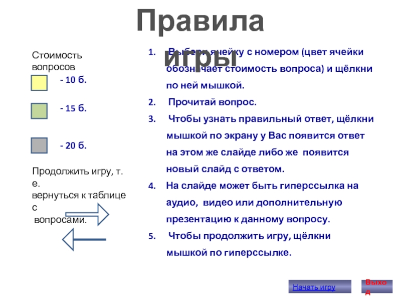 Начать игру Выбери ячейку с номером (цвет ячейки обозначает стоимость вопроса) и щёлкни по ней мышкой. Прочитай вопрос. Чтобы узнать правильный ответ, щёлкни мышкой по экрану у Вас появится ответ на этом же слайде либо же