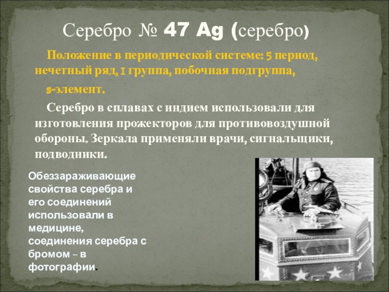 Обеззараживающие свойства серебра и его соединений использовали в медицине, соединения серебра с бромом – в фотографии.