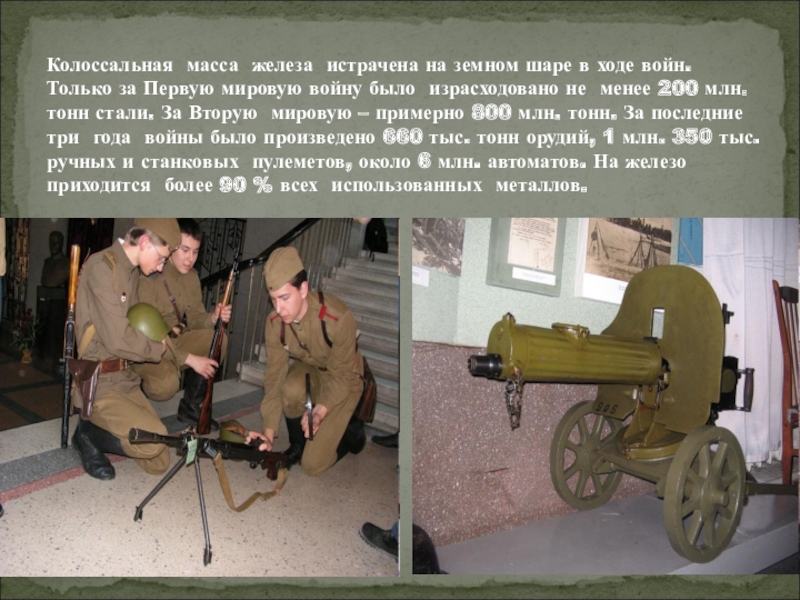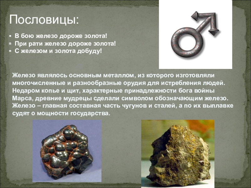 Железо являлось основным металлом, из которого изготовляли многочисленные и разнообразные орудия для истребления людей. Недаром копье и щит, характерные принадлежности бога войны Марса, древние мудрецы сделали символом обозначающим железо.