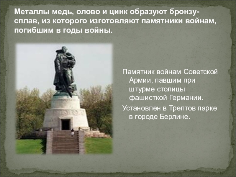 Памятник войнам Советской Армии, павшим при штурме столицы фашисткой Германии.