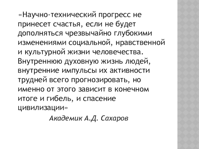 «Научно-технический прогресс не принесет счастья, если не будет дополняться чрезвычайно глубокими изменениями социальной, нравственной и