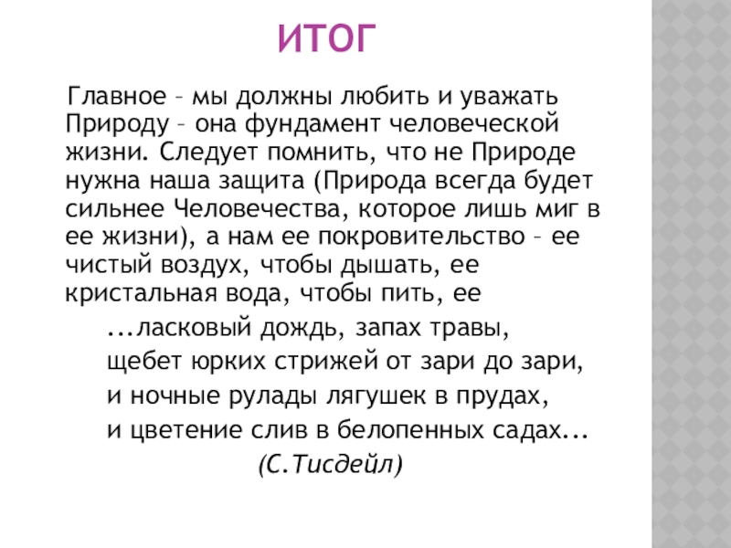 ИТОГ  Главное – мы должны любить и уважать Природу – она фундамент человеческой жизни. Следует помнить,