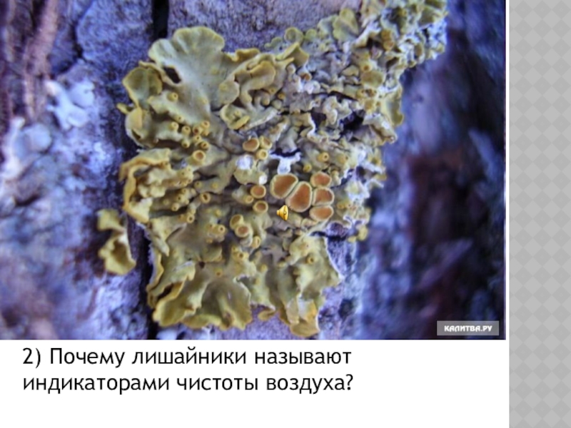 Слайд 7 2) Почему лишайники называют индикаторами чистоты воздуха?
