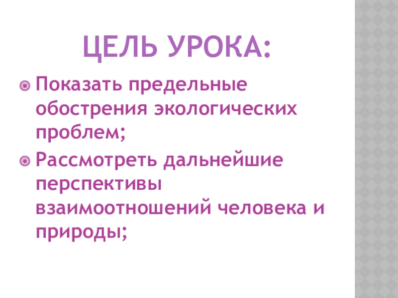 ЦЕЛЬ УРОКА:Показать предельные обострения экологических проблем;Рассмотреть дальнейшие перспективы взаимоотношений человека и природы;
