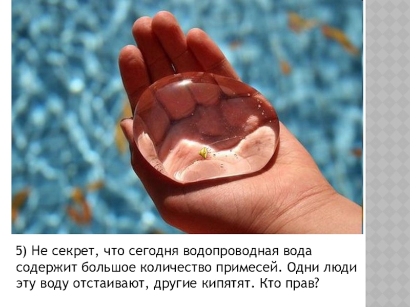 Слайд 10 5) Не секрет, что сегодня водопроводная вода содержит большое