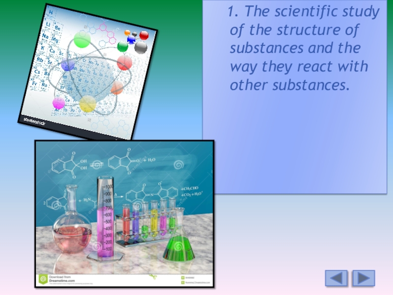 1. The scientific study of the structure of substances and the way they react