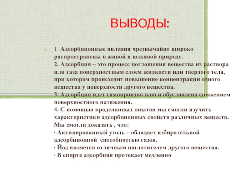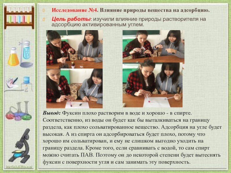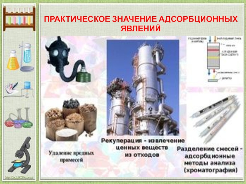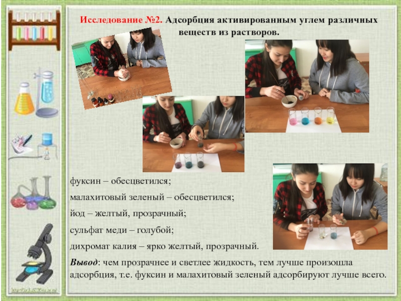 понаблюдать и проанализировать явление адсорбции, на примере активированного угля.
