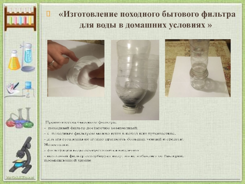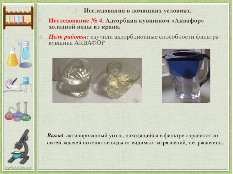Вывод: активированный уголь, находящийся в фильтре справился со своей задачей по очистке воды от видимых загрязнений, т.е. ржавчины.