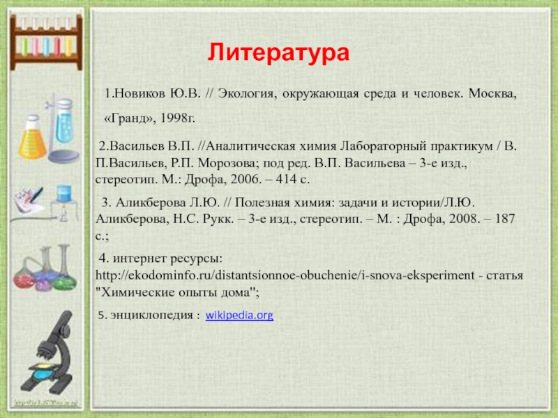 1.Новиков Ю.В. // Экология, окружающая среда и человек. Москва, «Гранд», 1998г.