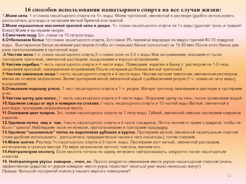 Слайд 1216 способов использования нашатырного спирта на все случаи жизни: