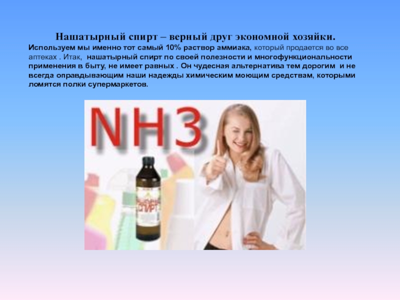 Слайд 10Нашатырный спирт – верный друг экономной хозяйки.