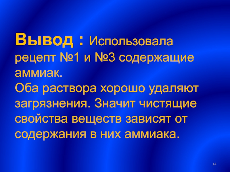 Слайд 14Вывод : Использовала рецепт №1 и №3 содержащие аммиак.