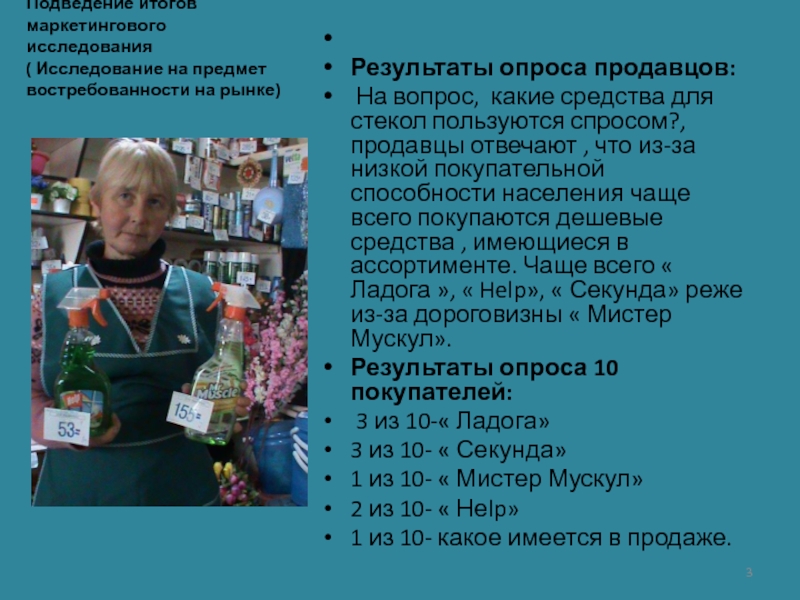 На вопрос, какие средства для стекол пользуются спросом?, продавцы отвечают , что из-за низкой покупательной способности населения чаще всего покупаются дешевые средства , имеющиеся в ассортименте. Чаще всего « Ладога », « Help», « Секунда» реже из-за дороговизны « Мистер Мускул».