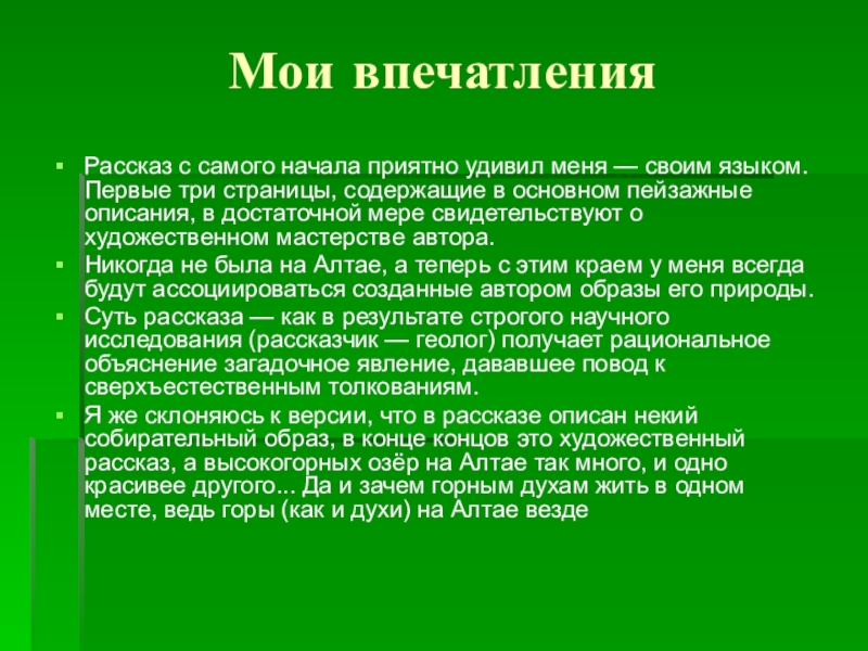 тему, а рассказ фантастический, хотя в нем и трудно определить грань между фантастикой и реальностью. В нём описывается высокогорное озеро необычайной красоты с налётом мистики, которое находится где-то в горах Алтая