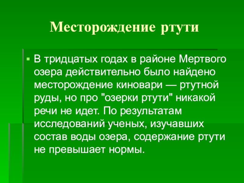 месторождение киновари — ртутной руды, но про "озерки ртути" никакой речи не идет. По результатам исследований ученых, изучавших состав воды озера, содержание ртути не превышает нормы.