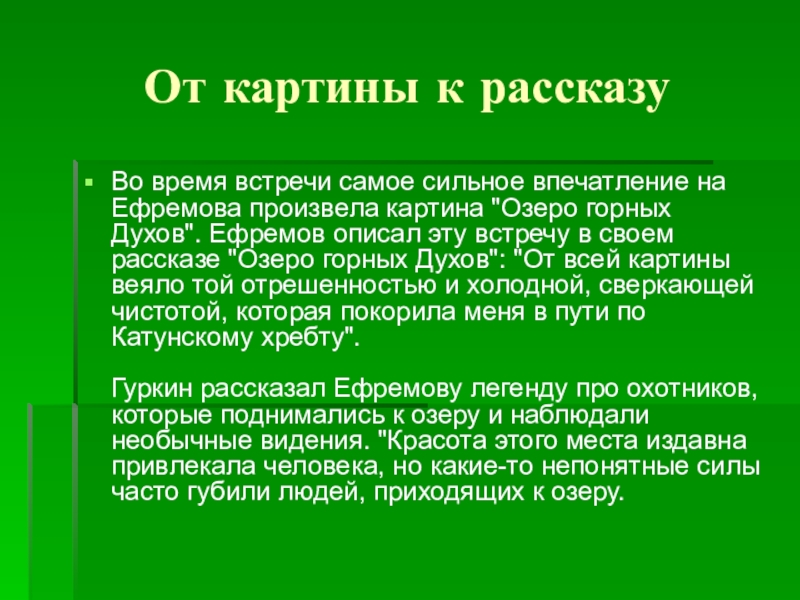 произвела картина "Озеро горных Духов". Ефремов описал эту встречу в своем рассказе "Озеро горных Духов": "От всей картины веяло той отрешенностью и холодной, сверкающей чистотой, которая покорила меня в пути по Катунскому хребту".